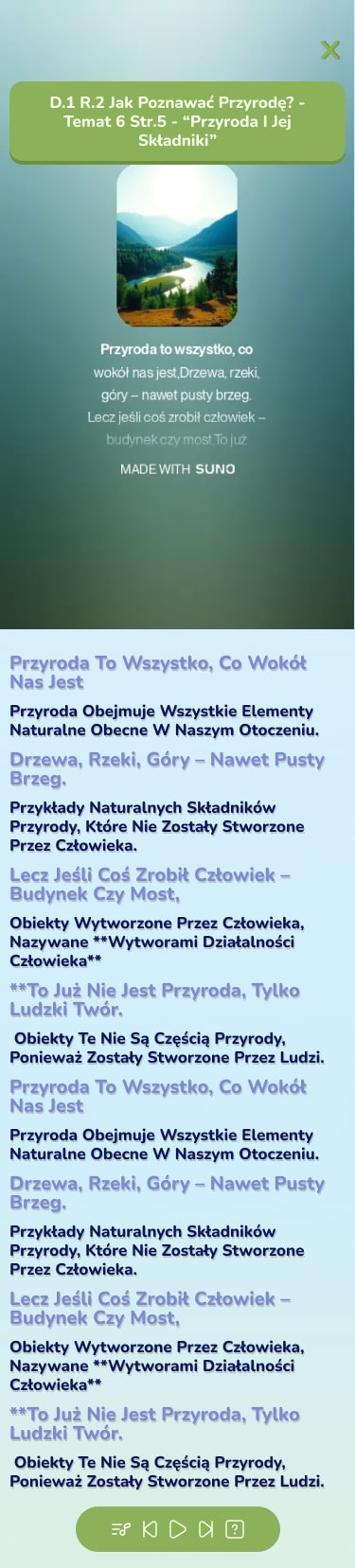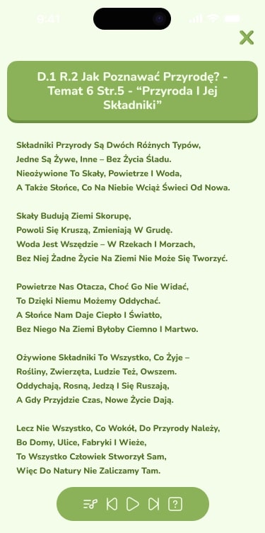 Sztuczna inteligencja wybiera kluczowe treści z podręczników i przerabia je na krótkie, melodyjne piosenki. Każda sekcja tematyczna w zestawie może być podsumowana piosenką, a pełną listę zawsze znajdziesz pod ikoną nuty w ścieżce nauki. Dzięki temu uczeń ma dostęp do gotowych powtórek w dowolnym momencie.